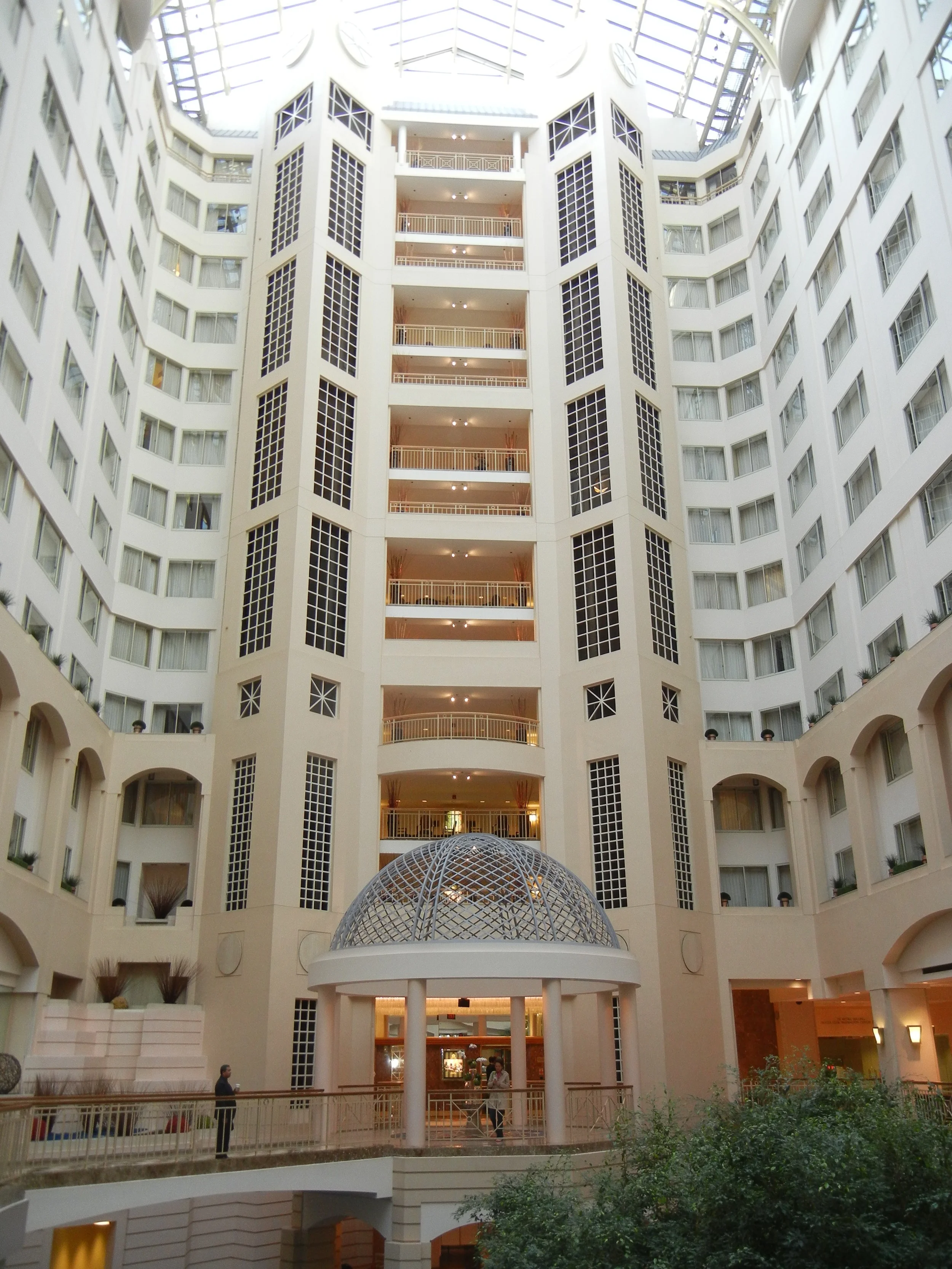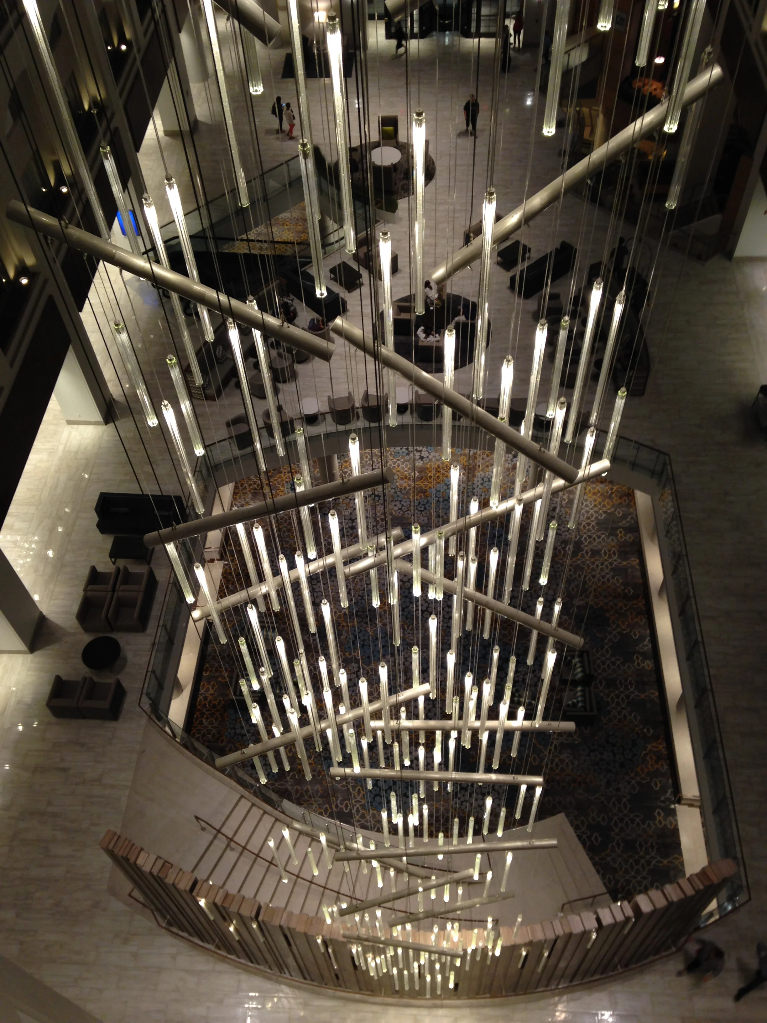 40,000sf of renovation to the public spaces of an atrium hotel in Washington, D.C. The renovation is punctuated by a dramatic +100-foot tall custom crystal chandelier. The installation is suspended from the existing atrium structure, and is programmed along with 36 crystal wall sconces to create the effect of a cascading waterfall. A cantilevered zebrawood wall receives the chandelier and is detailed to emphasize the feel of water rippling down its ridged surface. A stone stair curves along the face of the wall and reflects the light of the chandelier in its glass railings, which swoop continuously around the atrium opening.